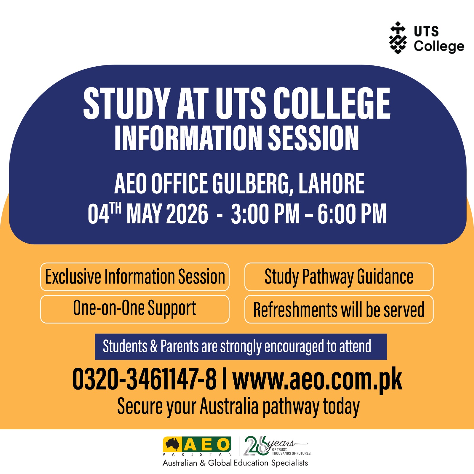 Physical Study at UTS College Information Session on 04th May Limited seats available — secure your spot today! Event Details...